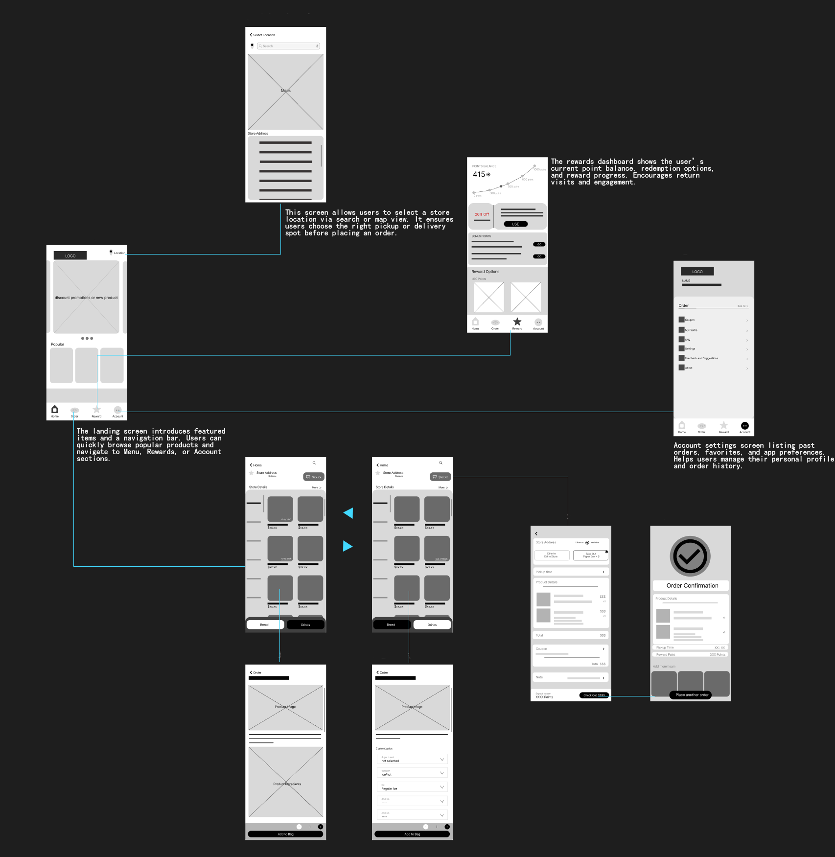 By outlining both primary and secondary navigation paths, I was able to spot friction points and opportunities for streamlining the experience—especially in areas like store switching, sold-out item handling, and reward point visibility.