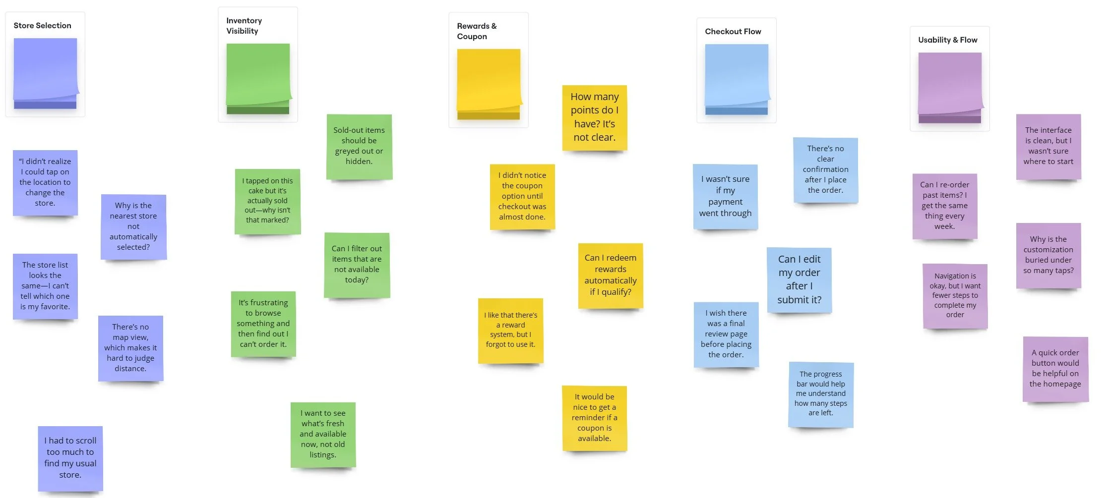 These themes were further categorized based on common goals users expressed, such as efficiency, clarity, engagement, and confidence. For example, users wanted a faster way to select stores, clearer visibility of sold-out items, better access to rewards, and more certainty during checkout.