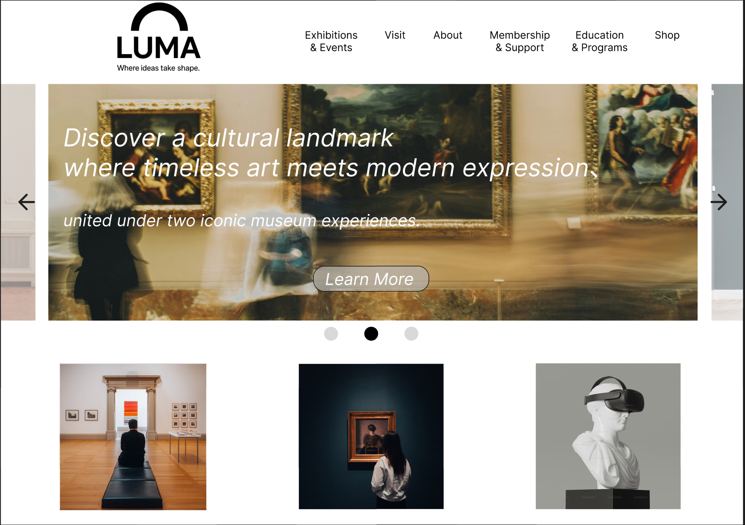 The goal of this project was to design a website for LUMA Museum from the ground up. Based on research insights, the primary objectives were to: